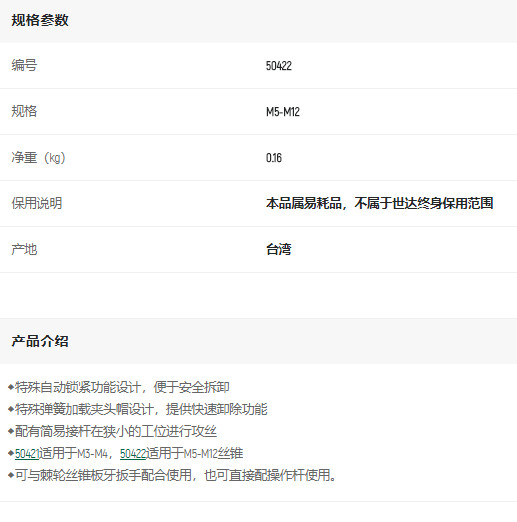 首頁>產(chǎn)品中心>其他手動工具>其他手動工具及配件>世達(dá)絲錐轉(zhuǎn)接頭M5-M12